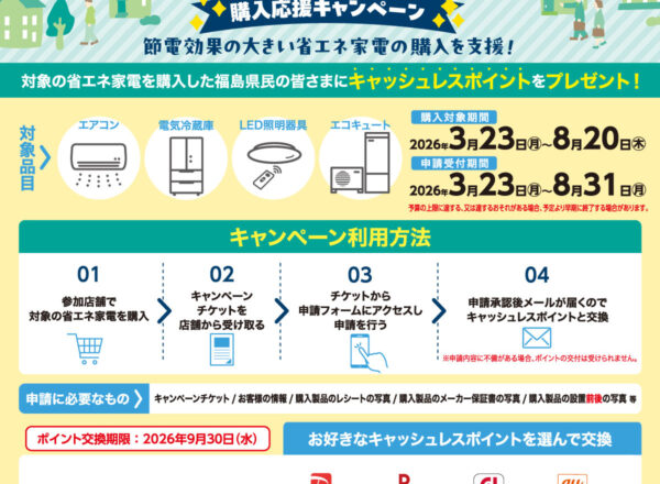 PDFはこちら 福島県では、電気代の負担軽減と省エネルギーの推進を目的として「福島省エネ家電購入応援キャンペーン」を実施しています。期間中に対象となる...